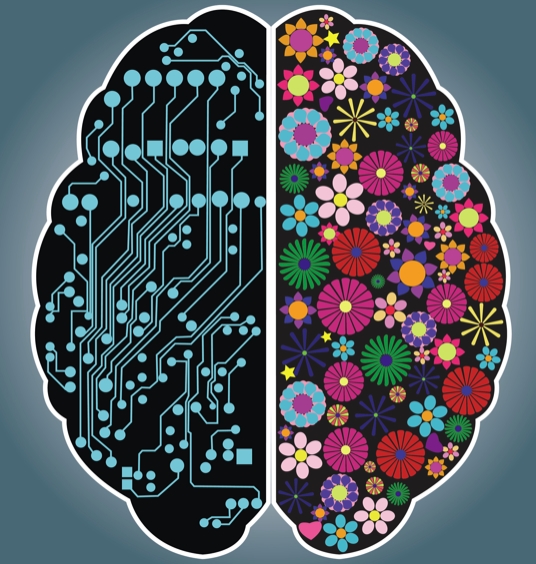 Left part of the brain is linked to linear thinking, facts, reason, scientific proof, calculus and emotional objectivity, i.e., representation of masculine principle. Right part of the brain is linked to creativity, intuition, empathy, imagination, rhythm, arts, i.e., feminine principles.