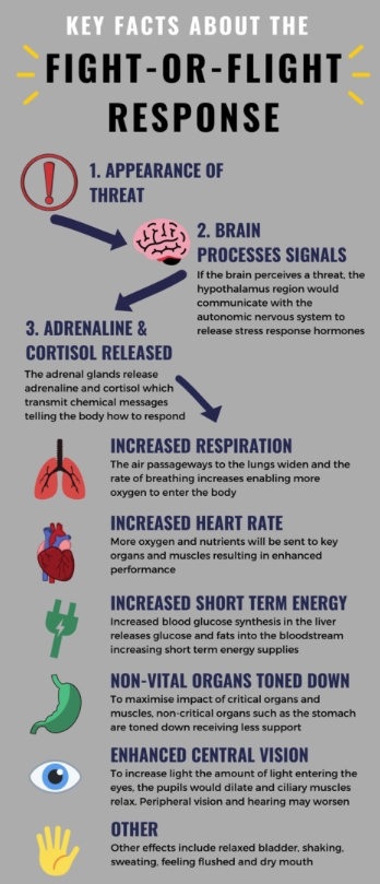 Fight-or-flight response (acute stress response) is a psychological reaction to a perceived harmful event, attack or threat to survival. This system helped our hunter/gatherer ancestors as a method of survival. For example, when exposed to a life-threatening situation, such as hungry predator attack, nerve signals from sensory organs (eyes, ears) would be sent to the brain. This would activate different bodily processes to enable a fast boost to the body and the man would have been ready to confront the predator or run form it.